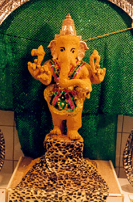 Ganesh représente un des concepts de base du symbolisme hindou. Sa tête d'éléphant symbolise le macrocosme ou le plan divin et cosmique, tandis que son corps humain se rapporte au microcosme ou au plan humain de l'individu. Ganesh est à l'origine de tous les événements de la vie. Il lève les obstacles, ou les pose, selon le temps d'un individu, d'un pays, d'un continent ou de la terre, évoqué par les écritures. En cette fin du XX° siècle, ses fidèles ont établi des temples à GANESHà New York, à Londres et depuis 1985 à Paris.